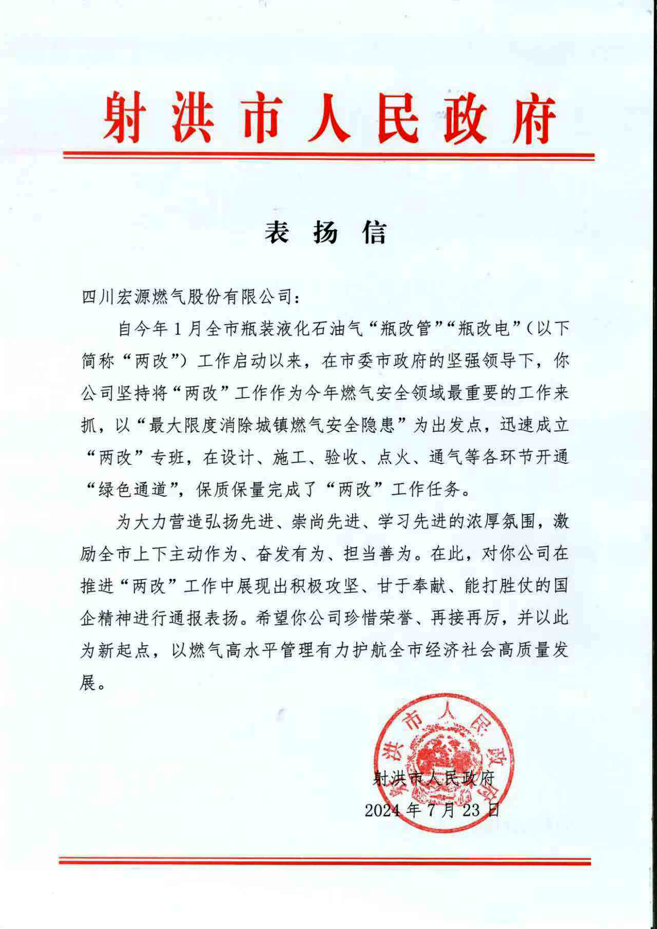 今年1月以來宏源公司在川投燃電集團(tuán)和市委市政府的堅強(qiáng)領(lǐng)導(dǎo)下,攻堅克難、保質(zhì)保量完成瓶裝液化氣“瓶改管”工作任務(wù)給予通報表揚;對宏源公司在推進(jìn)“兩改”工作中展現(xiàn)出積極攻堅、甘于奉獻(xiàn)、能打勝仗的國企精神以及為射洪市經(jīng)濟(jì)社會發(fā)展做出的辛勤努力和重要貢獻(xiàn)給予充分肯定。